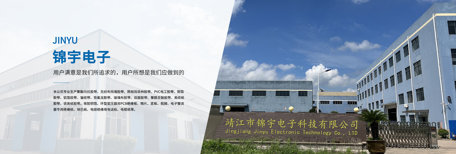 靖江市錦宇電子科技有限公司地處—靖江市。與上海、南京隔江相望,滬寧高速和京滬高速將蘇錫常及京廣連為一體,東依開放港口城市南通,西連新長鐵路,南臨長江萬噸船用碼頭,北接寧通一級高速公路,水陸交通便捷,經(jīng)營環(huán)境優(yōu)良。 本公司專業(yè)生產聚酯瑪拉膠帶、無紡布擋墻膠帶、照相用菲林膠帶、PVC電工膠帶、銅箔膠帶、鋁箔膠帶、皺紋帶、鐵氟龍膠帶、玻璃布膠帶、雙面膠帶、聚酰亞胺膠帶、美紋紙膠帶、諾美紙膠帶、背膠銅箔、環(huán)型變壓器用PCB絕緣板、隔片、底板、假腳、電子整流器專用絕緣紙、塊巴紙、電纜絕緣用電話紙、電纜紙等。 公司依靠先進的科學管理,精良的生產裝備,合理的工藝設計,完善的檢測設備,以著“科技創(chuàng)新、質量為本、誠信服務”的信念。并嚴格貫徹ISO9001國際質量體系的程序和規(guī)格,為廣大用戶提供優(yōu)質的產品與滿意的服務。 多年來,公司本著“用戶滿意是我們所追求的,用戶所想是我們應做到的”的經(jīng)營理念;“質量保障,價格合理,服務誠信”的企業(yè)宗旨。熱忱歡迎海內外各界人士、朋友前來洽談、合作,攜手共創(chuàng)輝煌的明天。
